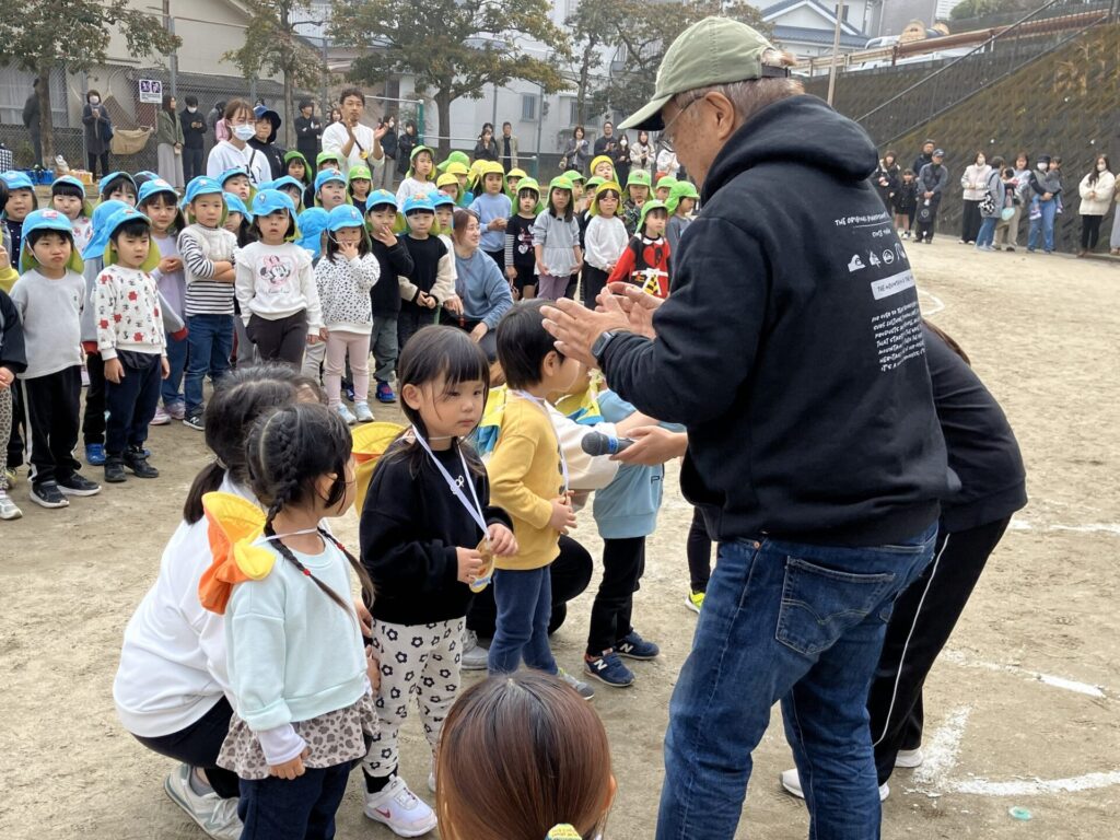 最後は園長先生から頑張ったで賞のメダルをもらいました。今まで練習を頑張ってきた事・完走できた事に家族や先生たちから大きな拍手とメダルをもらい、嬉しそうでした。